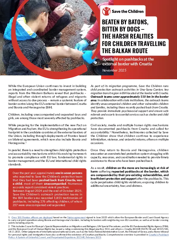 While the European Union builds an integrated and coordinated border management system, pushbacks – illegal and often violent returns of refugees and migrants without access to due process – remain a systemic feature of border control along the EU’s external borders. Children, including unaccompanied and separated boys and girls, are among those most severely affected by pushbacks – approximately one in seven persons who reported to Save the Children’s protection team that they had been pushed back from Croatia to BiH was a child, most of them unaccompanied (data covering period from August 2024 to October 2025).