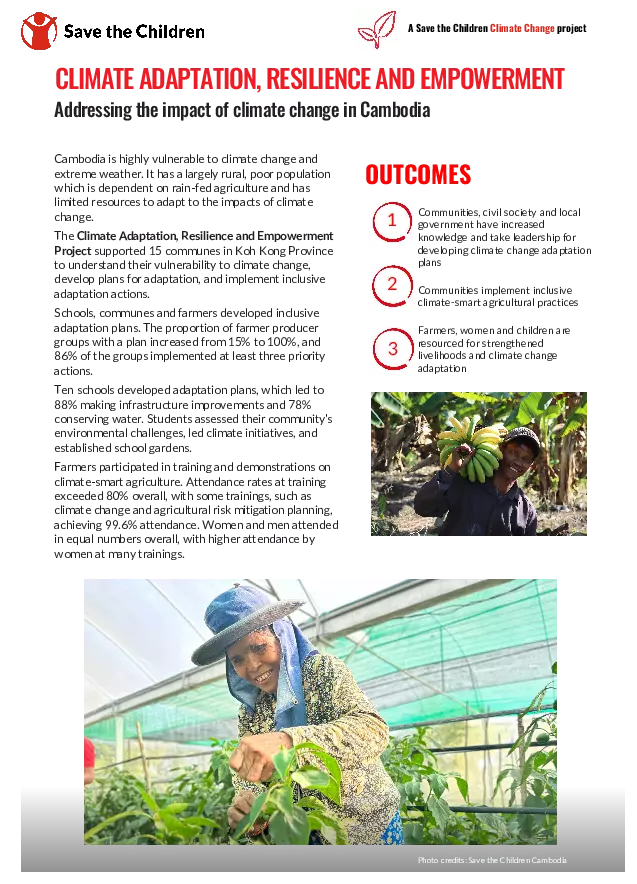 The Climate Adaptation, Resilience and Empowerment Project supported 15 communes in Koh Kong Province to understand their vulnerability to climate change, develop plans for adaptation, and implement inclusive adaptation actions. Communes, schools and farmer producer groups established inclusive adaptation plans, and implemented priority actions such as water conservation and infrastructure retrofitting. Farmers adopted climate-smart agriculture techniques, resulting in improved productivity and statistically significant increases in average annual profits.
