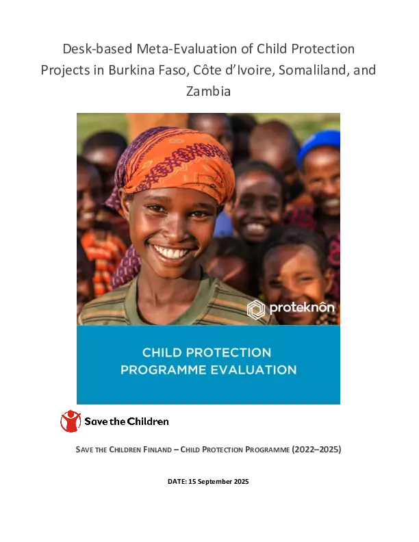 The report is a meta-evaluation of Save the Children Finland’s Global Child Protection programme, implemented from 2022 to 2025 in four countries in Africa – Burkina Faso, Côte d´Ivoire, Somaliland and Zambia – spanning development, humanitarian and peace-building contexts.