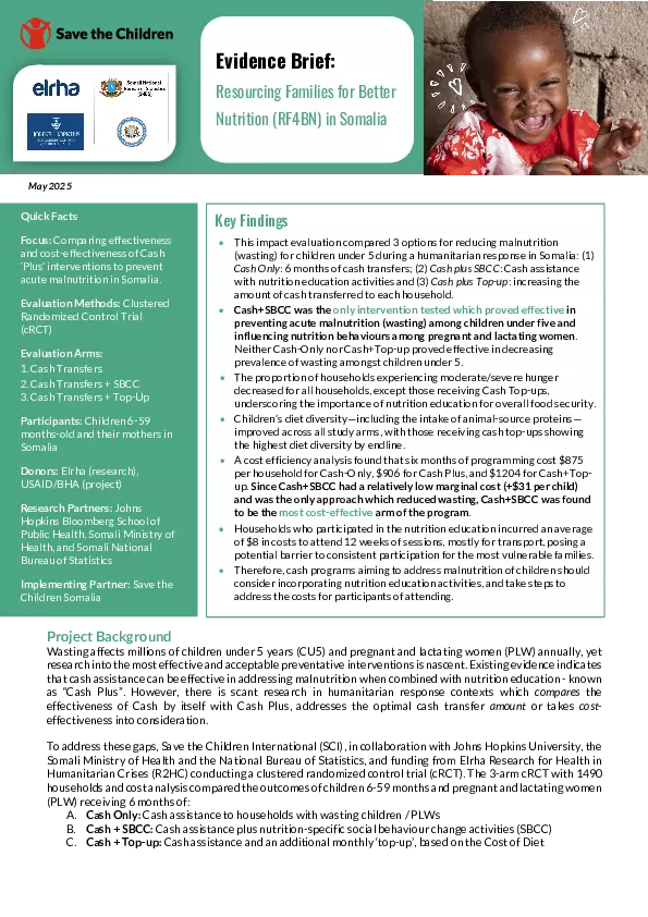 To address these gaps, Save the Children International (SCI), in collaboration with Johns Hopkins University, the Somali Ministry of Health and the National Bureau of Statistics, conducted a randomized control trial to determine the most effective cash intervention in preventing acute malnutrition or wasting among children under 5 in Somalia.