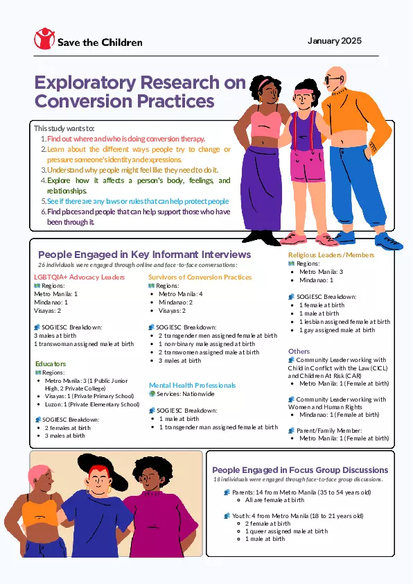 In the Philippines, conversion practices is a concealed concern, often veiled as corrective practices within families, religious institutions, and community settings. The practice is sustained by the country’s deeply rooted religious values, which reinforce heteronormative ideals and create social pressure for people of diverse SOGIESC to conform to traditional norms. Despite numerous studies and professional stances highlighting the negative impacts of this practice, explicit prohibitions and legal protections remain absent. The continued pervasiveness of conversion practices and the lack of mechanisms against it highlight the critical need for further action to eliminate conversion practices and promote a more affirming environment for all Filipinos.