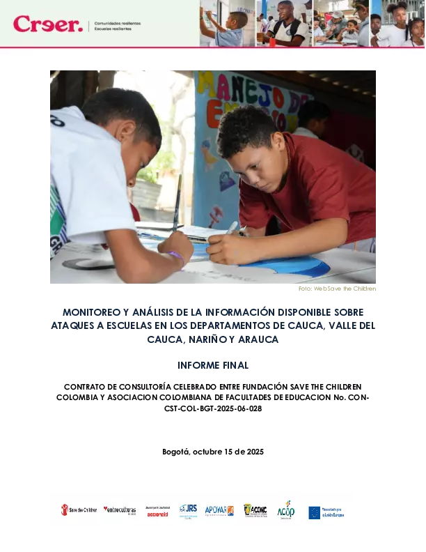 This technical report consolidates the results of monitoring and analyzing attacks on schools in Colombia during the period from January 2024 to August 2025, in the departments of Cauca, Nariño, Valle del Cauca, and Arauca—territories prioritized due to their high exposure to armed conflict and humanitarian risk.