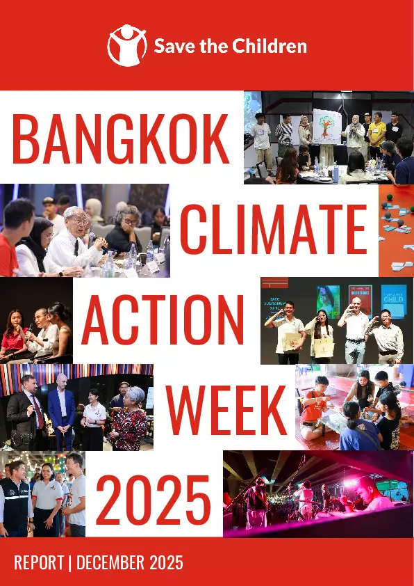 This report documents Save the Children Thailand’s roles as an organizing partner in Bangkok Climate Action Week 2025 (BKKCAW), a city-wide climate action festival aimed at amplifying children’s and young people’ s voices in addressing climate and environmental crises. Bringing together children and youth from diverse regions of Thailand and Hong Kong, the project created inclusive spaces for participation, dialogue, and advocacy on climate change, environmental degradation, and their impacts on children’s lives.