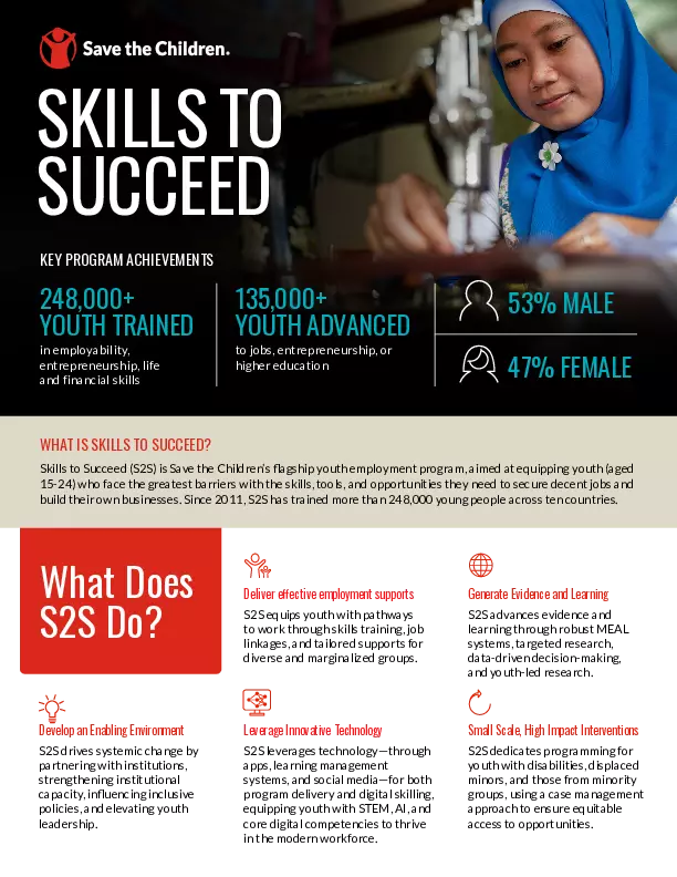 Skills to Succeed (S2S) is Save the Children’s flagship youth employment program, aimed at equipping youth (aged 15-29) who face the greatest barriers with the skills, tools, and opportunities they need to secure decent jobs and build their own businesses. Since 2011, S2S has trained more than 248,000 young people across ten countries.
