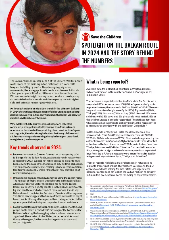 An in-depth analysis of migration trends in the Western Balkans in 2024 shows that although most official sources report a sharp decline in new arrivals, this only highlights the lack of visibility for children and families on the move. When different data sources across Europe are collected, compared and supplemented by observations from outreach actors and other stakeholders providing direct services to refugees and migrants, there is a strong indication that many children and adults are arriving and transiting through the region unnoticed, unregistered and unsupported.