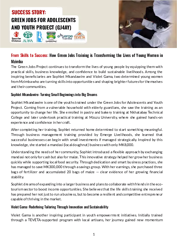 The Green Jobs for Adolescents and Youth Project is supporting vulnerable adolescents and youth (15 to 24 years) to successfully transition into adulthood and achieve sustainable economic independence. The publication tells the stories of Sophlet and Violet who have been trained under the Green Jobs project and are now making investments to support themselves and their families using their newly gained skills and knowledge.